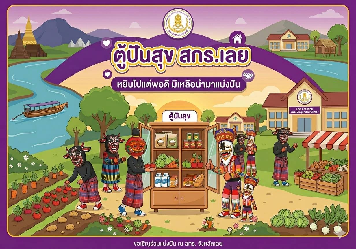 วันพุธที่ ๘ เมษายน พ.ศ.๒๕๖๙ สำนักงานส่งเสริมการเรียนรู้ประจำจังหวัดเลย นำโดย นายทัศน์พล เรืองศิริ ผู้อำนวยการสำนักงานส่งเสริมการเรียนรู้ประจำจังหวัดเลย ร่วมขับเคลื่อนนโยบาย "ตู้ปันสุข" เพื่อบรรเทาความเดือดร้อน แบ่งปันสิ่งของจำเป็นให้กับผู้ที่ได้รับผลกระทบจากสถานการณ์น้ำมันขาดแคลน ซึ่งส่งผลให้ราคาสินค้าอุปโภคบริโภคปรับตัวสูงขึ้น กระทบต่อค่าครองชีพและความเป็นอยู่ของประชาชนในวงกว้าง ณ สำนักงานส่งเสริมการเรียนรู้ประจำจังหวัดเลย