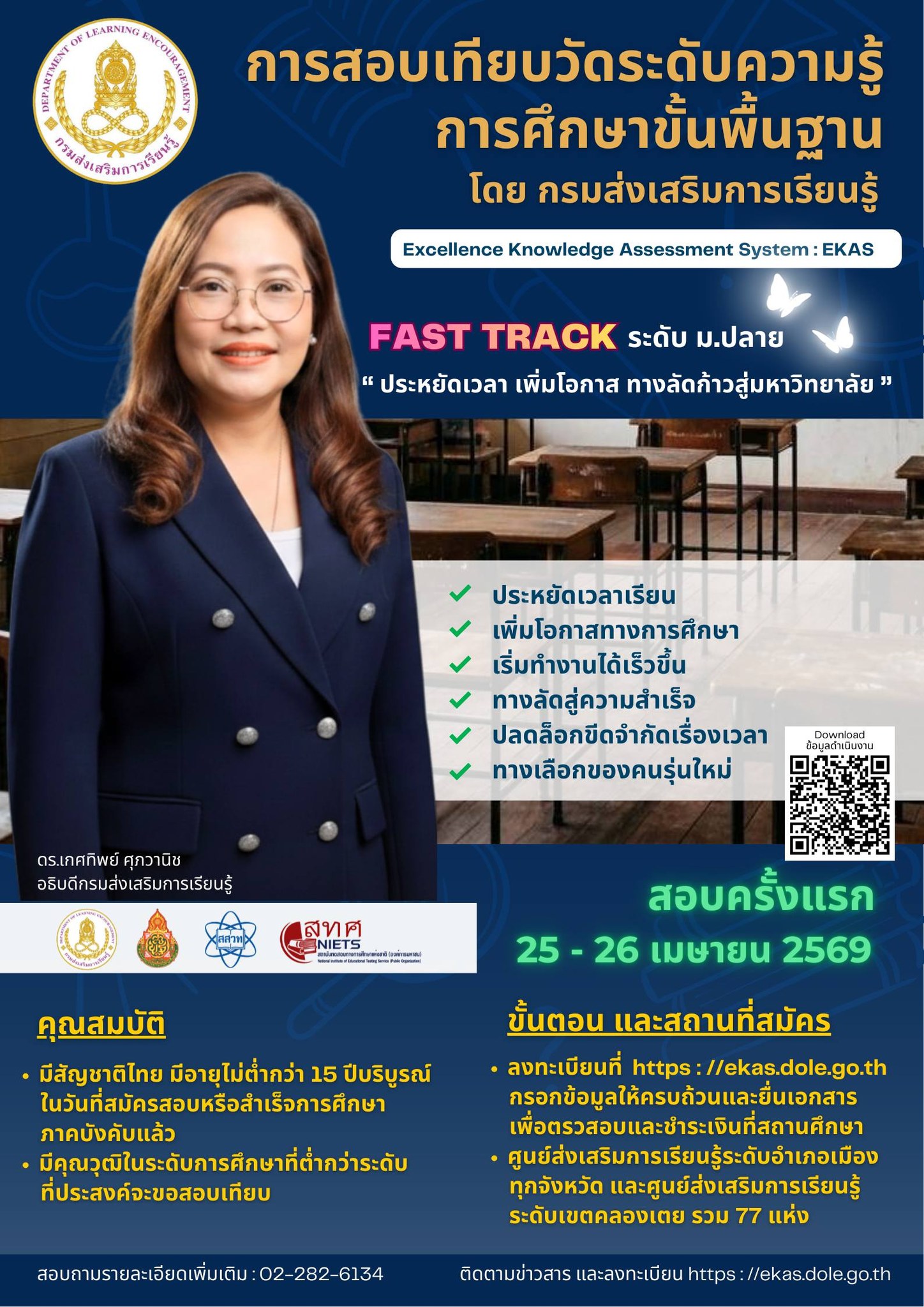 กรมส่งเสริมการเรียนรู้ กระทรวงศึกษาธิการ เปิดโอกาสให้บุคคลที่มีความรู้ ความสามารถ และความเป็นเลิศทางปัญญา เข้ารับการทดสอบประเมินเพื่อรับวุฒิการศึกษา ผ่านระบบการสอบเทียบวัดระดับความรู้ การศึกษาขั้นพื้นฐาน (Excellence Knowledge Assessment System : EKAS)